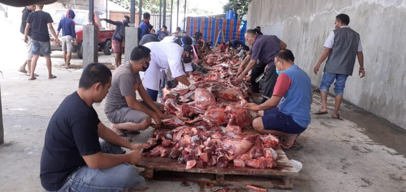Pemotongan hewan kurban dilakukan setelah dilaksanakan solat Idul Adha di masing-masing masjid dengan tetap menerapkan protokol kesehatan.