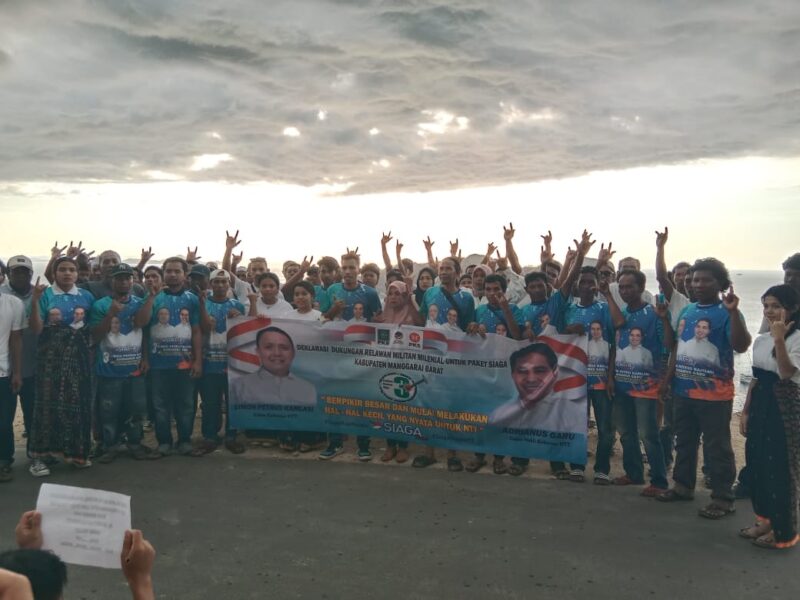 puluhan ribu milenial yang mendeklarasi dukungan untuk Paket SIAGA. Puluhan ribu relawan itu tersebar di 21 Kabupaten dan 1 Kota di NTT. Masing-masing Relawan tersebut sudah melakukan deklarasi untuk mendukung Paket SIAGA di Pilgub NTT.