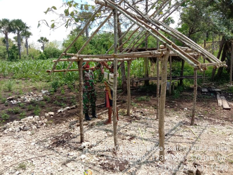 Kupang, Savanaparadise.com,- Bintara Pembina Desa (Babinsa), anggota Koramil 1604-02/Camplong Kodim 1604/Kupang, Serda Manuel Amaral, bantu ringankan beban warganya dengan bangun rumah kebun. Kegiatan ini bertujuan untuk meningkatkan kemanunggalan TNI dengan rakyat.