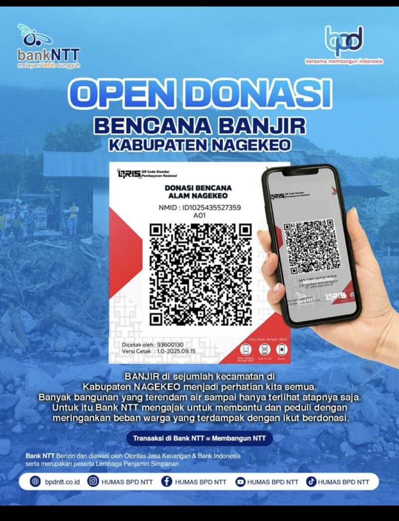 Melalui program Open Donasi Bencana Banjir Kabupaten Nagekeo, Bank NTT mengajak seluruh masyarakat untuk peduli dan ikut serta memberikan dukungan. Donasi dapat disalurkan secara langsung melalui QRIS dengan nama rekening “Donasi Bencana Alam Nagekeo”.