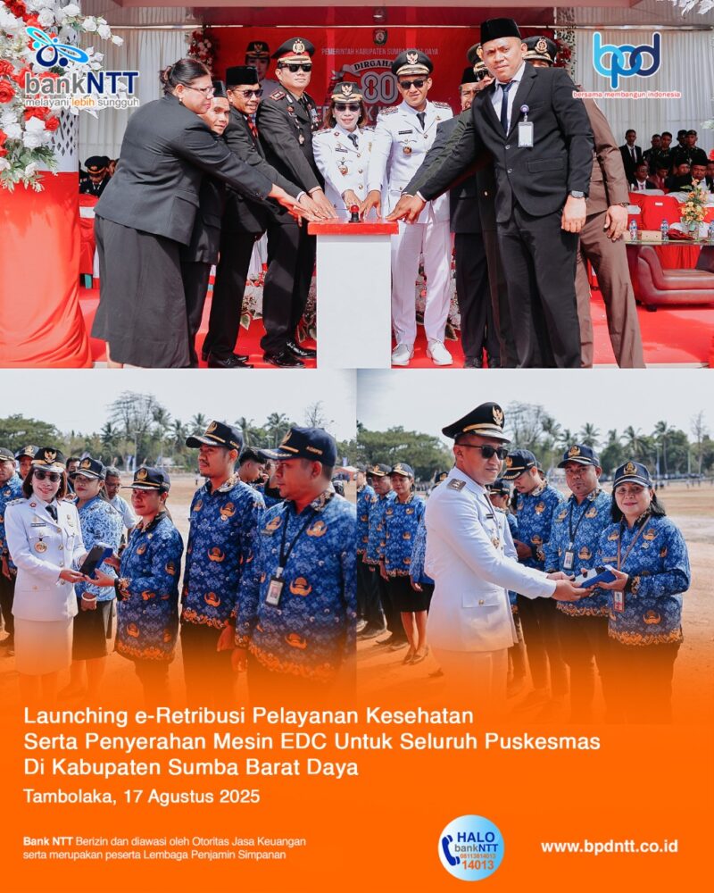 Sejalan dengan tema HUT RI yang menekankan transformasi digital, Bank NTT bersama Pemerintah Daerah meluncurkan layanan E-Retribusi. Melalui sistem ini, seluruh transaksi retribusi di 16 puskesmas di Sumba Barat Daya akan dilakukan secara non tunai sehingga lebih transparan, cepat, dan akuntabel. Launching ditandai dengan penekanan tombol sirene oleh Bupati Sumba Barat Daya, bersama Wakil Bupati, Ketua DPRD, Dandim Waitabula, Kapolres SBD, Kajari Sumba Barat, Kepala Dinas Kesehatan, serta Pimpinan Cabang Bank NTT Waitabula.