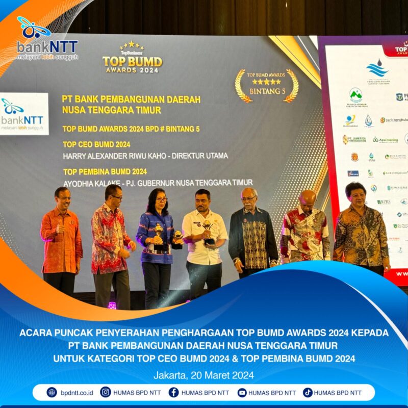 Tahun ini TOP BUMD AWARDS 2024, memberikan penghargaan kepada PT Bank Pembangunan Daerah Nusa Tenggara Timur untuk 2 Kategori Awards yaitu : TOP CEO BUMD 2024 kepada Harry Alexander Riwu Kaho, Direktur Utama Bank NTT dan TOP PEMBINA CEO BUMD 2024 kepada Ayodhia Kalake, Penjabat Gubernur Nusa Tenggara Timur.