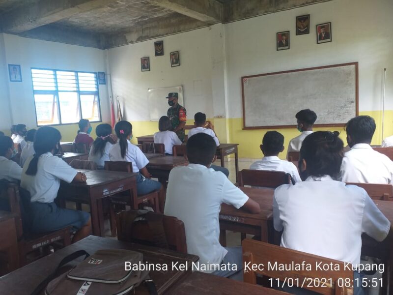 Kupang, Savanaparadise.com,- Hadir memberikan materi tentang Wawasan Kebangsaan, Bintara Pembina Desa (Babinsa) Koramil 1604-07, Alak Serma Alexander Mahoklory, ajak siswa-siswi SMK Negeri 8 Kupang untuk selalu gelorakan cinta tanah air. Kegiatan itu bertempat di RT. 006/RW.002, Kelurahan Naimata, Kecamatan Maulafa, Kota Kupang, Senin, (11/01/2021).