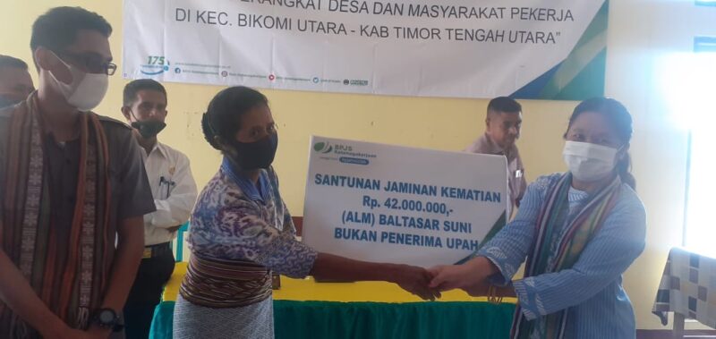 Penyerahan santunan tersebut berlangsung di Aula Kantor Camat Bikomi Utara, Kabupaten Timor Tengah Utara (TTU), usai digelar kegiatan Sosialisasi program BPJS Ketenagakerjaan kepada perangkat desa dan masyarakat pekerja di Kecamatan Bikomi Utara.