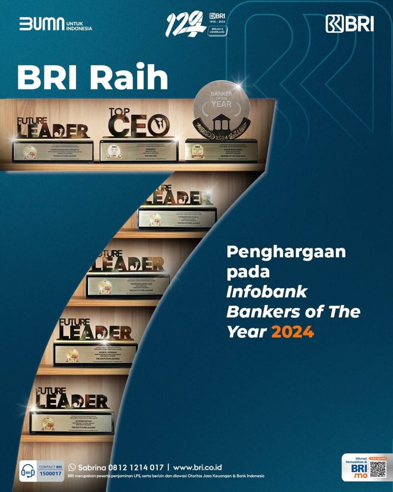 Jakarta, Savanaparadise.com, – Menjelang perayaan Hari Ulang Tahun (HUT) ke-129 BRI yang jatuh pada 16 Desember 2024 mendatang, PT Bank Rakyat Indonesia (Persero) Tbk (BRI) menerima 7 penghargaan pada ajang Top 100 CEO & The 200 Leader Future Forum 2024. Acara yang diselenggarakan oleh Infobank Media Group di Hotel Ritz-Carlton, Jakarta (29/11) ini menjadi wadah untuk mengapresiasi para pemimpin dari berbagai sektor atas kontribusi dan perannya.