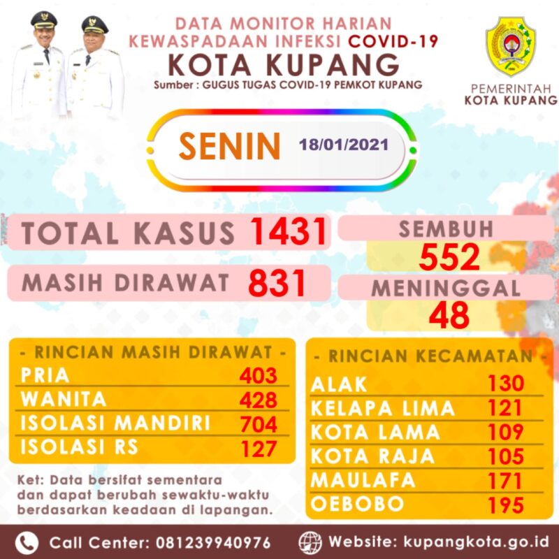 Kupang, Savanaparadise.com,- Gugus Tugas Covid-19 setiap hari selalu mengeluarkan data terbaru mengenai perkembangan kasus Covid-19 Kota Kupang, Provinsi Nusa Tenggara Timur (NTT). Update data monitor pada hari Senin, 18 Januari 2021 Disampaikan kepada Masyarakat Kota Kupang.