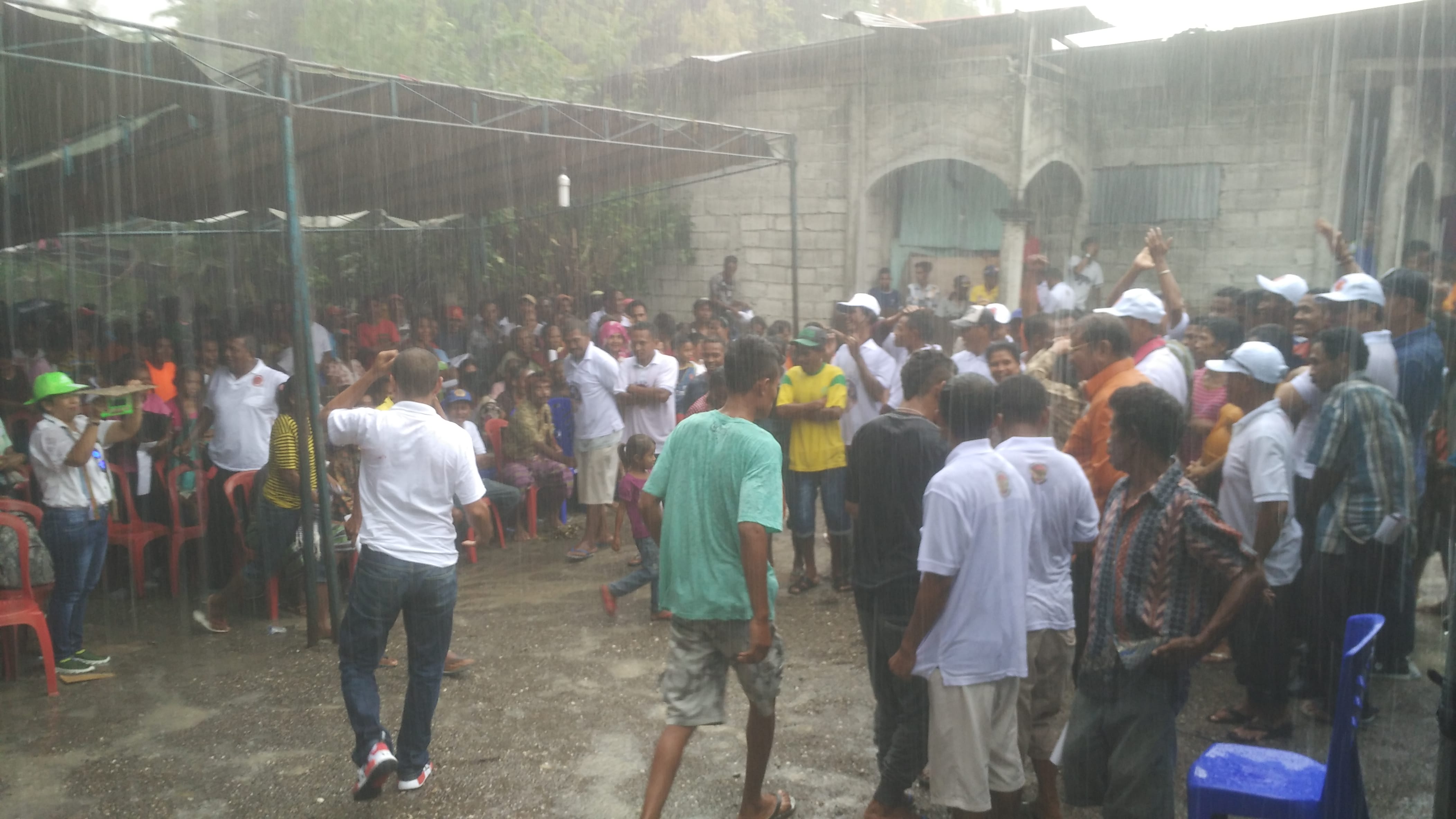 Melihat Laiskodat yang sudah basah dan tetap bersemangat memaparkan program kerja dibawa guyuran hujan yang semakin deras, masyarakat, Ibrahim Medah dan sejumlah pengurus partai koalisi ikut mandi hujan.