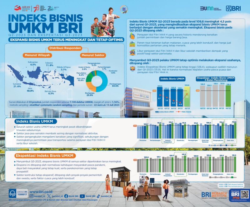 Jakarta, Savanaparadise.com,– Melalui BRI Research Institute, PT Bank Rakyat Indonesia (Persero) Tbk mempublikasikan Indeks Bisnis UMKM Q3-2023 dan Ekspektasi Q4-2023. Dari hasil riset tersebut, menunjukkan bisnis UMKM tetap tumbuh positif, ditunjukkan oleh Indeks Bisnis UMKM yang masih berada di zona ekspansi yaitu 104,7, disamping itu Indeks Ekspektasi Bisnis UMKM tetap berada di level yang tinggi (121,8).