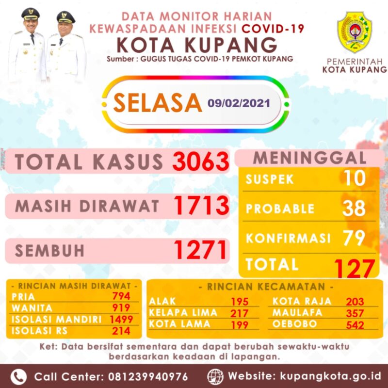 Kupang, Savanaparadise.com,- Rilis data monitor kembali dikeluarkan oleh Satgas Covid-19 Kota Kupang. Berdasarkan data yang terima redaksi, Rabu, (10/2/2021), total kasus Covid-19 sebanyak 3.063 Orang, naik sebanyak 57 Orang.
