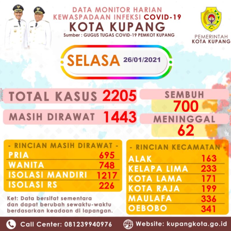 Kupang, Savanaparadise.com,- Pemerintah Kota (Pemkot) Kupang melalui Gugus Tugas Penanganan dan Pencegahan Covid-19 kembali mengeluarkan update data monitor pada hari Selasa, 26 Januari 2021.