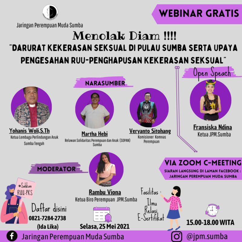 Webinar ini bertujuan ingin menyuarakan kekerasan seksual terhadap perempuan dan anak di pulau Sumba yang beberapa pekan terakhir masuk dalam kategori keadaan darurat dan butuh perhatian serius dari pihak-pihak terkait.