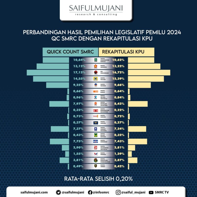 Pada pemilihan legislatif, QC SMRC menemukan 8 partai yang memeroleh suara di atas ambang batas 4 persen, sama dengan penetapan hasil rekapitulasi KPU 2024. QC SMRC menemukan PKB mendapatkan 10,64 persen; hanya beda 0,02 persen dengan rekapitulasi KPU; yakni 10,62 persen. QC SMRC untuk Gerindra 13,12 persen; KPU 13,22 persen, selisih 0,1 persen. Untuk PDIP selisih QC SMRC dengan rekapitulasi KPU sebesar 0,4 persen; Golkar 0,74 persen; Nasdem 0,41 persen; PKS 0,45 persen; PAN 0,13 persen; dan Demokrat 0,32 persen. Adapun selisih QC SMRC dengan rekapitulasi KPU untuk PPP sebesar 0,06 persen; PSI 0,09 persen; Perindo 0,26 persen; dan partai-partai lain di bawah 0,2 persen.