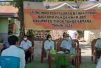 Bupati TTU Drs. Djuandi David, didampingi Kadis Sosial TTU, Ir. Matheos M.J Dami dan Kepala Bulog Cabang Atambua, Naomi Uly, saat Launching penyaluran beras…