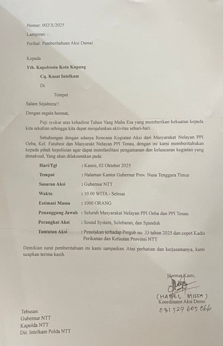 Surat pemberitahuan ini juga ditembuskan kepada Gubernur NTT, Kapolda NTT, dan Direktur Intelkam Polda NTT.(SP)
