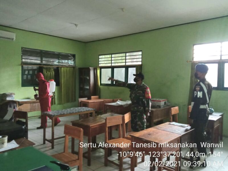 Kupang, Savanaparadise.com,- Guna memutus penyebaran Virus Corona (Covid-19) di wilayah NTT khususnya di wilayah Kupang, Tim Satgas Covid-19 Kodim 1604/Kupang yang dipimpin oleh Bati Ops Kodim 1604/Kupang Serma Eben Heizer Djara tak patah semangat untuk terus melakukan penyemprotan disinfektan, Selasa, (2/2).
