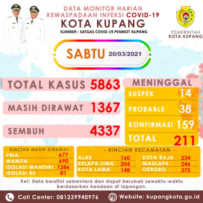 Update data monitor disampaikan gugus tugas Covid-19 kepada masyarakat Kota Kupang, melalui juru bicaranya, Ernest Ludji bahwa, total Kasus sebanyak 5.863 Orang, naik sebanyak 218 Orang. Masih dirawat sebanyak 1.367 Orang, naik sebanyak 77 Orang.