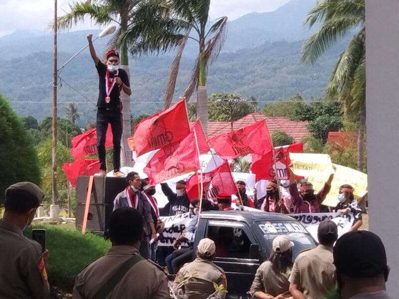 Larantuka, Savanaparadise.com,- Puluhan Mahasiswa yang tergabung dalam Gerakan Mahasiswa Nasional Indonesia (GMNI) Cabang Flores Timur menggelar aksi demonstrasi di depan halaman Kantor Bupati Flores Timur (Flotim), Senin, (14/6/21).
